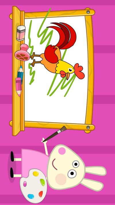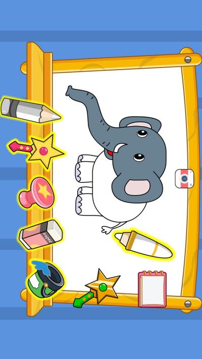 2.图形填色,有5大类图形,动物、家具、建筑、交通工具和植物,可自由在图形上填色上色,并且可以播放动画。