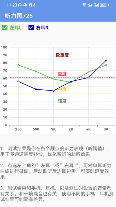 4、支持听力测试和多通道响度补偿,让你随时了解自己的听力状况,并获得个人专属的声音效果!也支持直接录入第三方机构的测试报告。