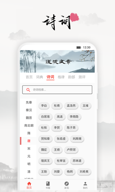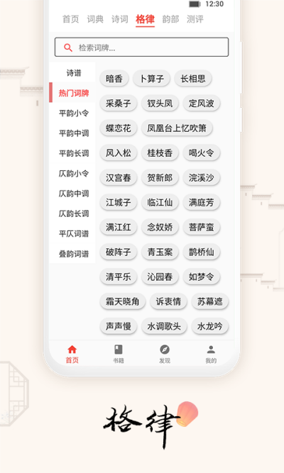 3、格律检测:收录平水韵、词林正韵、中原音韵、中华今韵四种韵表,及古代诗律、词牌两千多个。用户可在学习和创作时查询它们,也可对作品进行检测,找出作品在格律、押韵方面的缺陷或不足。
