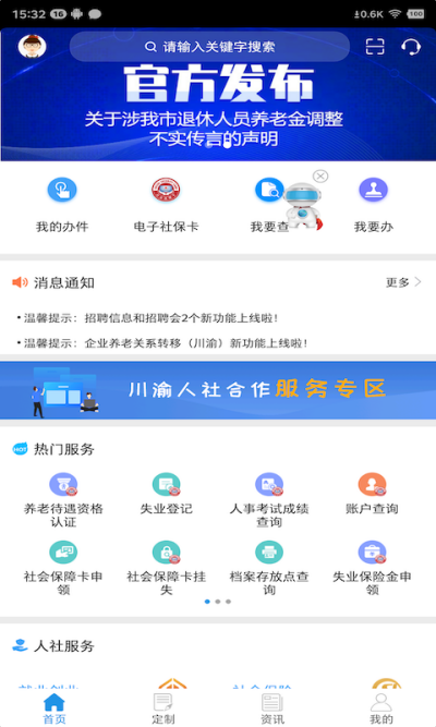 “重庆人社”是重庆市人力资源和社会保障局为加强“公共服务信息化”建设,顺应“移动互联”技术发展,推出的基于智能手机的查询、办事、咨询等功能于一体的移动业务服务平台