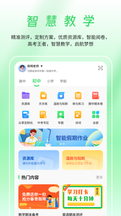 1.智慧教学:包括智慧教与智慧学,做到因材施教。提供智能批改与分析,错题收录,学情诊断,个性化学习方案等产品与服务。