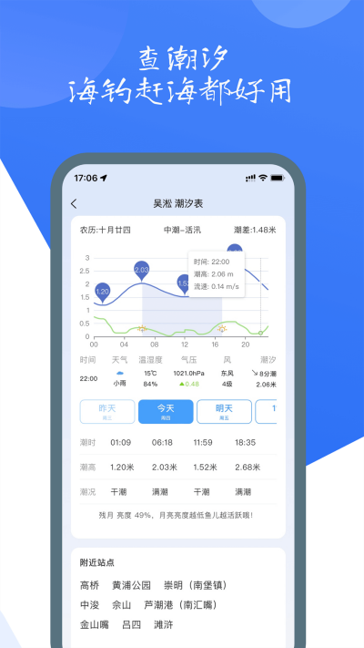 出门野钓掌握各种户外活动所需数据,实时气压监控气压实际变化,全国300+潮汐观测点,一键查询潮况,何时涨落潮、潮水流速一目了然,矶钓海钓赶海好帮手,祝您出行愉快!