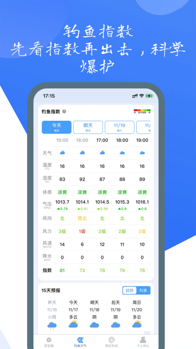 钓鱼天气/钓鱼指数功能是基于钓点位置的钓鱼天气查询工具,可定位到钓位!综合了钓点的天气、温度、气压、湿度、风速、风向、降水、月相等10+项鱼儿活跃相关因素经过智能算法输出的逐小时、逐天(24小时X14天)钓鱼指数,参照钓鱼指数可以让您更加简单的成为钓鱼高手,次次爆护。