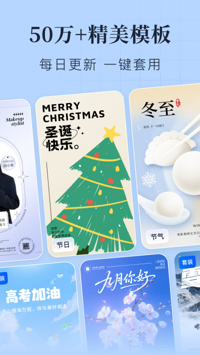 「精美模板」海报、长图、日签、喜报/战报、公众号首图、小红书封面、简历、名片、邀请函,电商海报、直播间素材、手抄报、LOGO、壁纸、头像、朋友圈、传单、宣传册、易拉宝等200+场景。无论是企业营销、活动展览、电商引流、行政办公还是自媒体创作,都能轻松满足需求。