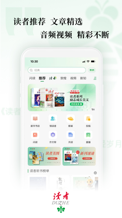 读者App 3.0.0全新版本,在原有功能基础上,开启新增板块如学生帮、读者听书、电子书刊、新华书店、文旅文创等,同时我们甄选了更加丰富的内容向您展示,包括读者精选、读者美图、敦煌文化等音视频内容,以及读者直播、AI功能等,更多优质内容敬请期待。圈子社区全面升级为读者蜂巢,更多互动玩法,邀您共享体验!