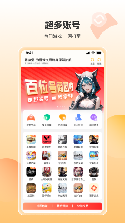 畅游堂是一款有价值的游戏账号交易软件,主打热门游戏的账号交易服务,在这里为用户提供更安全的交易模式和各种保障服务,以及更多高级装备的游戏账号。 通过畅游堂应用,用户可以轻松购买各种网络账号,例如:游戏账号、网站账号、软件账号等等。用户也可以在应用中发布自己要售卖的物品信息,交给专业客服处理,从而省去了用户自己处理物品售卖的繁琐事务,专业客服会根据物品情况和市场行情,以优的价格进行售卖,用户也可以随时查看物品的售卖进度和终售卖结果。