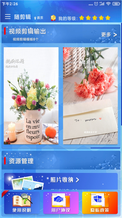 随剪辑是一款简单实用的手机视频剪辑应用。其中包含视频剪辑输出功能、手机照片分组收纳功能、手机视频分组收纳功能、手机音乐分组收纳功能。精灵剪辑使用简单,功能强大,让你随时随地快速将照片、视频剪辑配乐合成输出,保留美好的记忆。