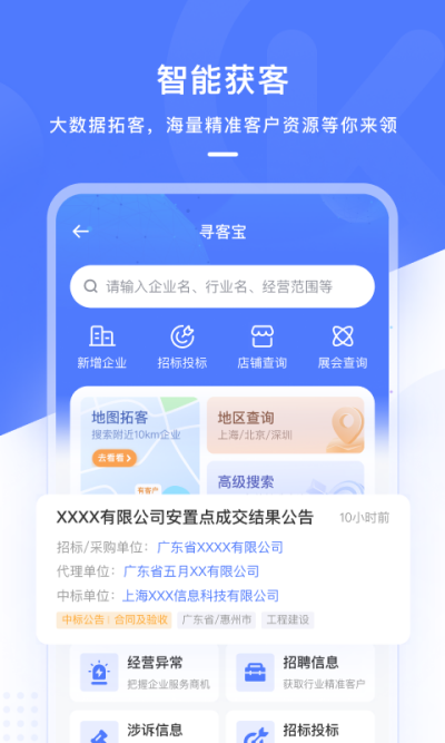 寻客宝——大数据拓客利器,节省销售搜索客户资料时间,快速获取海量精准客户线索;地图模式支持查找附近客户,有效提升外勤人效;