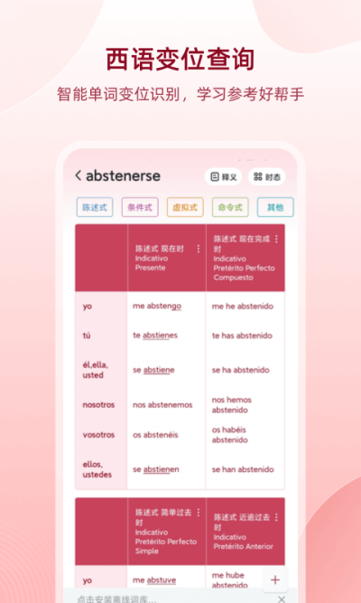 - 西语动词变位查询,提供17种时态的动词变位反查功能;
