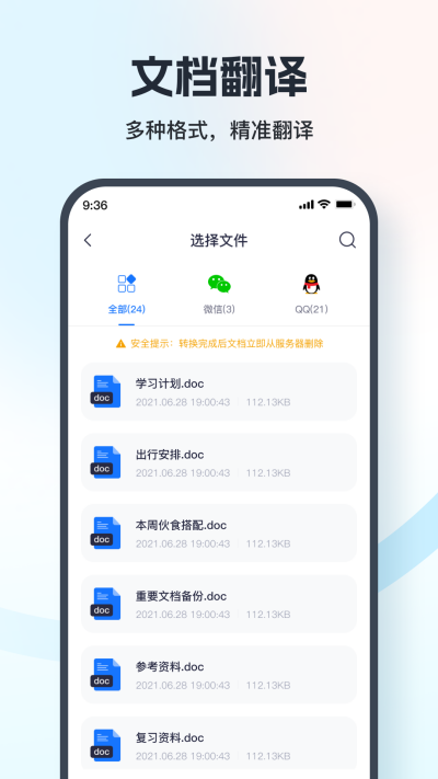 支持导入各类文件,如pdf、word、excel、ppt和txt等进行翻译,准确率高翻译速度快