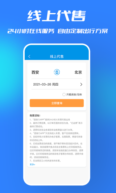 “西铁行APP”是中国铁路西安局集团有限公司官方出品的手机应用软件。线上代售,提供7*24小时线上订票、席位车次自由选择、无上限添加常用联系人等功能;车站服务,包括接站送站、行李搬运、商务候车厅、鲜花礼宾等优质服务让您的旅途更方便省心;列车服务,旅途点餐、方便快捷、为您送餐到座;车站美食,地域特产、特色小吃专人配送到站;企业服务,商务急件一日到达、招商平台优质资源;货运查询,物流信息快速追踪;西铁会员,超值权益,畅享折扣,品质出行。
