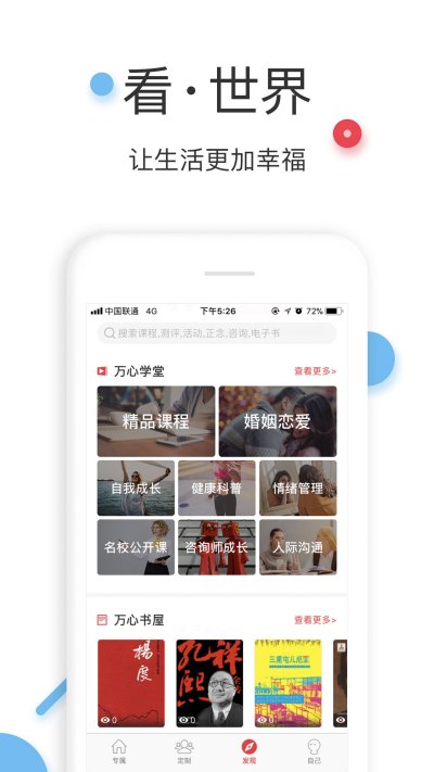 万心社是一款为企业员工提供心理健康和精神成长文化服务的APP,集在线课程、正念冥想、电子书、线下活动、心理测试、心理咨询等一体,全方位帮助员工缓解工作压力、改善工作情绪、提高工作积极性、增强员工自信心、有效处理同事/客户关系、迅速适应新的环境、克服不良嗜好等问题,提升他们的个人生活质量和工作绩效,从而使员工个人和企业都能够受益。
