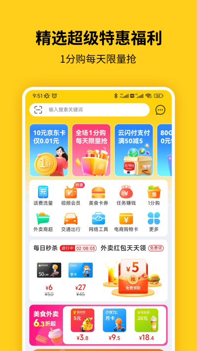 虚拟充值全覆盖:视频会员、音乐会员、电商购物卡、美食卡券、外卖商超、交通出行、娱乐休闲等充值购物实惠根本停不下来!
