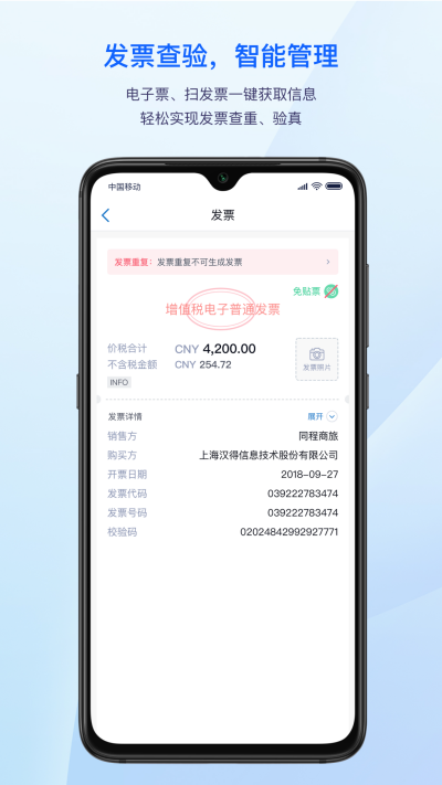 发票多形式智能管理:除手动填报发票信息,还可以进行一键扫描二维码,实现发票自动识别、查重、验真,更可以与微信、支付宝卡包及其他第三方应用,直接拉取电子票据信息,实现票据结构化整理,在线审核、统计。