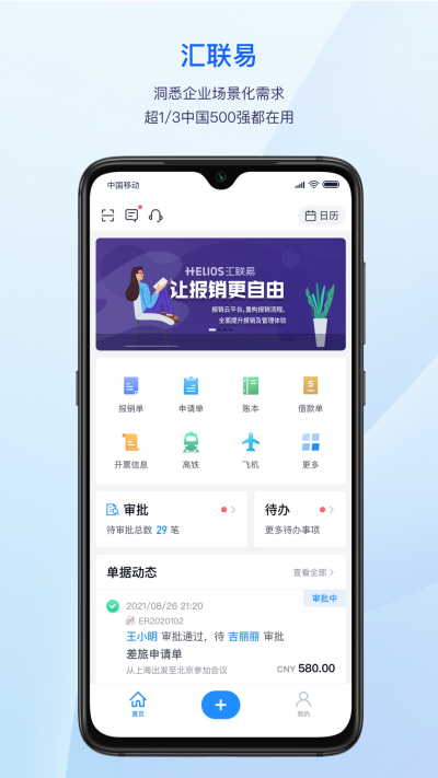 差旅多场景深度对接:集酒店、机票、高铁、出行用车、商务宴请、会务预订等一系列场景服务于汇联易,商旅安排轻松搞定,报销免垫资、免贴票。