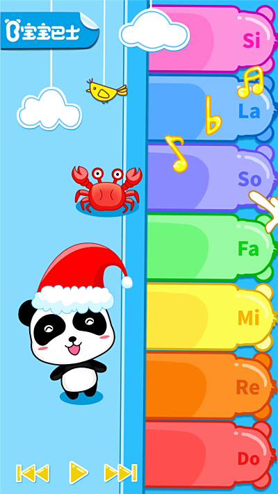 用音乐叫醒打瞌睡的宝宝,我们一起来跳舞吧。宝宝们分别可以利用钢琴、竖琴、吉他、架子鼓四种乐器弹奏主调,配合上欢快的旋律,为你们自己谱写出一段崭新的乐章吧。