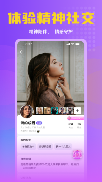 天聊,是一个正在崛起的精神服务社交平台。我们正在为逃离熟人社交和短视频疲劳的人群,建立一个连接“人与人”之间聊天社交为用户提供情绪价值服务的APP!