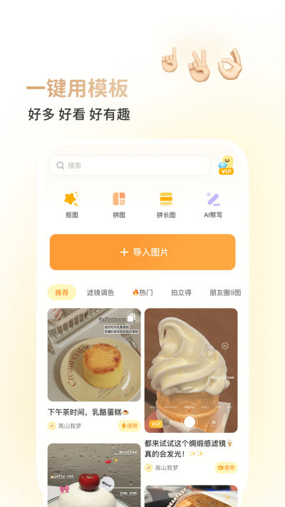 黄油内置海量的模板,海报写真、美食、风景、节日、萌宠、宝宝……一键套用,免去设计排版的烦恼。