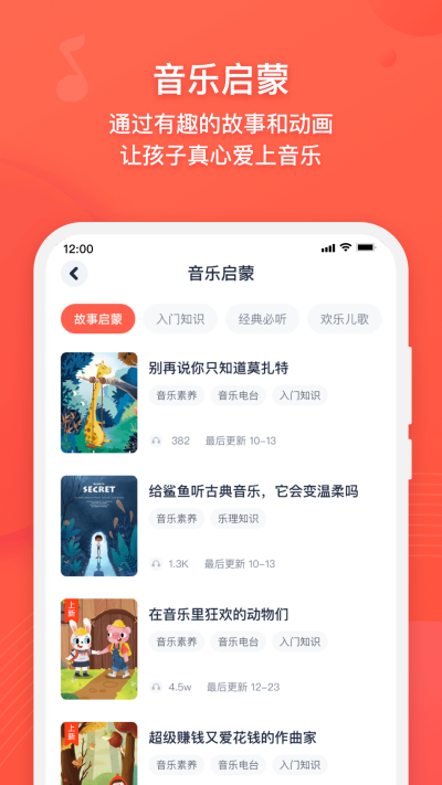 伴鱼音乐是针对0-12岁年龄层儿童,做音乐教育、乐器辅助学习的软件,涵盖了音乐启蒙学习、音乐素养提升、乐器考级等方面,基本满足了儿童音乐学习的各个方面。