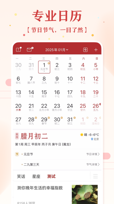 丰富的黄历信息,如每日宜忌、时辰宜忌、节日节气等,还有更多适合你的精彩内容。