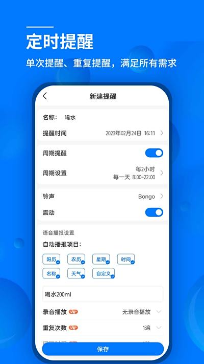 5.整点报时和半点提示,报时时可以报日期、报星期、报农历,让您不看手机时刻掌握时间。