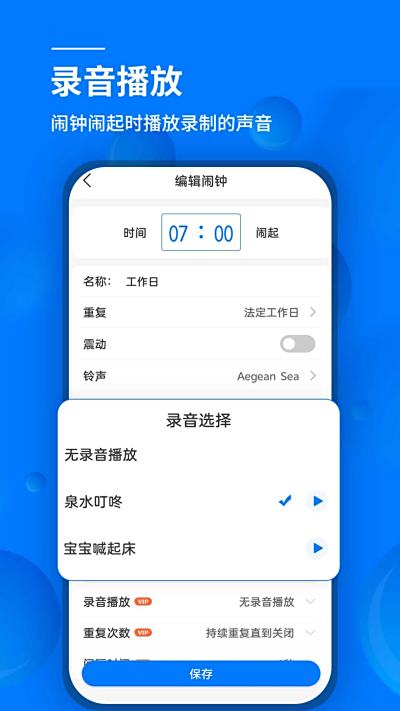 人性化的录音功能,让您可以在闹钟闹起或者提醒弹出时播放录音,如果您想用爱人的声音叫您起床,或者录制便于老人理解的方言,那就赶紧使用起来吧。