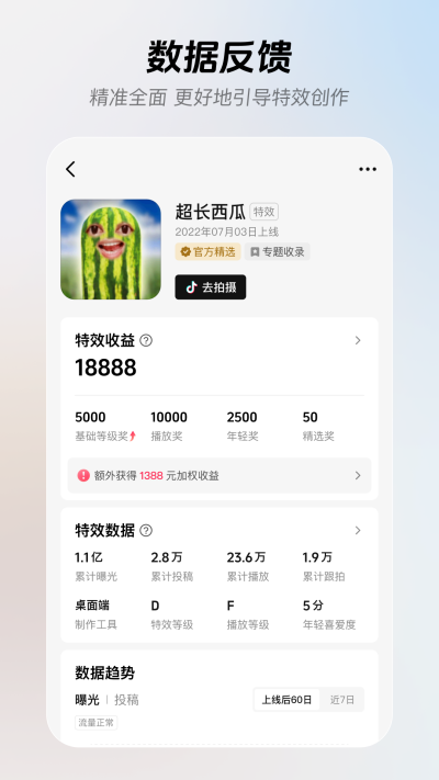 像塑,原名「特效君」,是抖音特效的创作与交流平台。在这里,你可以通过强大的特效创作工具和完善的创作服务,自由发挥创意,创作专属特效。同时,依托抖音的强大算法,你的特效还将被推荐到数亿抖音用户面前,成为他们拍摄和记录生活的重要方式,当然,在这个过程中,你将通过创作特效获得流量扶持、吸引更多抖音粉丝,并获得丰厚的创作收入!