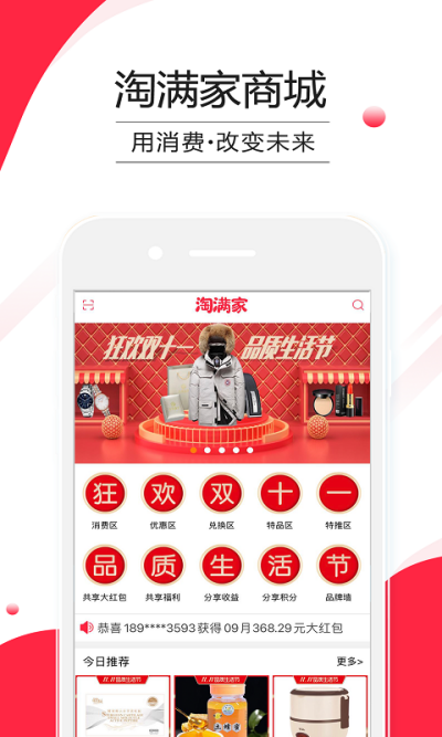 “淘满家商城”是全新的OTO电商平台,旨在帮助诚信商家建立长期,稳定,忠诚度高,可裂变的销售通路的同时,帮助消费者买到货真价实的商品。