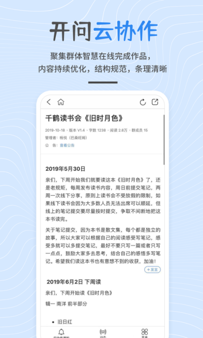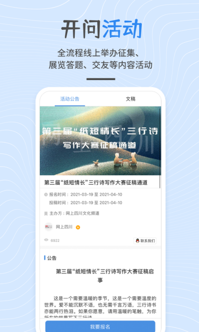 可以发起或者参与书画、摄影、各类征文征稿类活动,同时也可以一起学习、表白打卡、意见征集、共同创作、协作研究等。