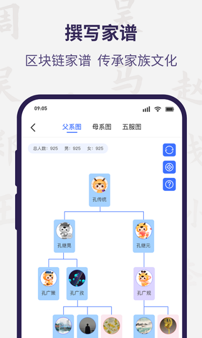 宗谱链可以清晰的了解到您的家族关系,及整个家族人数、体系,通过树形图谱形式展现,区别于传统纸质家谱,让家谱更科技,更完整,更直观的展现!