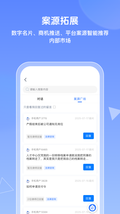 案源拓展:数字名片、商机推送、法律AI平台案源推荐、内部市场