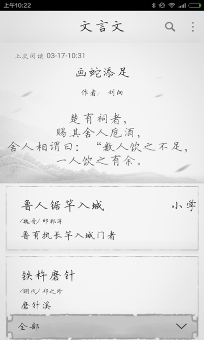 其次,文言文收录了古文观止这部经典之作的文言文内容,是市面上古文内容甚全的app。
