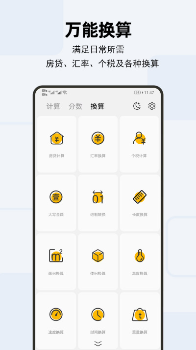 天天计算器是一款集基础计算、科学计算、分数计算、房贷计算、汇率换算、个税计算、大写金额、进制转换、长度换算、面积换算、体积换算、温度换算、速度换算、时间换算、重量换算、压强换算、存储换算、功率换算、热量换算、力换算、角度换算、密度换算、电阻换算、油耗量换算、能量换算、日期换算等为一体,完美解决各种计算、换算的超级全能计算器。还有历史记录,语音播报,复制,大写等功能,操作简单方便。黑夜白天皮肤随心切换!