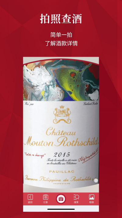 【拍照查酒,懂酒更快一步】特色拍照查酒功能,无需费力辨别酒标上的外文字母,只要简单拍拍酒标,或将相册中的酒标图片上传,立即可获取酒款的酒庄、产区、品种、风味、名家评分和参考信息等信息。