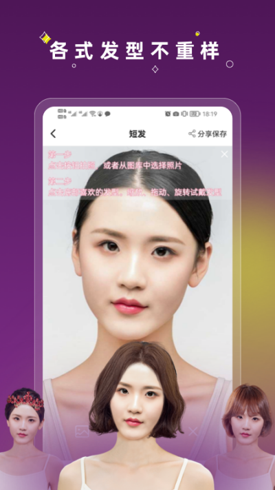 美发相机是一款换发型相机软件,通过发型设计与脸型搭配、找到自己适合的发型。通过发型相机的发型模拟,换各种风格的发型,让你不在为换发型而烦恼。