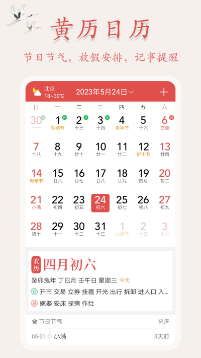 (1)日历:公历、农历,放假安排,传统节日和二十四节气日期标注提醒,更有详细的节日、节气科普介绍;