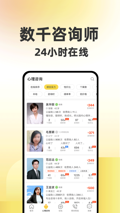 自2014年深耕心理服务领域,累计服务超千万用户,平台心理咨询好评率高达98.42%!聚焦情感困扰、焦虑压力、婚姻咨询等需求,提供严选心理咨询师服务与超低价倾诉热线(0.2元/分钟起),全方位守护您的心理健康。